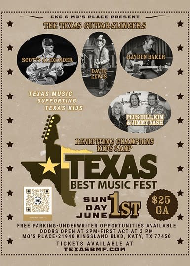 X-ALT-DESC;FMTTYPE=text/html:<!DOCTYPE html><html><head><title></title></head><body aria-disabled="false"><p>Join us for this year&#39\;s Texas Best Music Fest on June 1st at Mo&#39\;s Place in Katy! This event was created in 2013 to bring together some of the best Texas Musicians to help some of the most deserving children in Houston. Past artists include Roger Creager\, Turnpike Troubadours\, and the Josh Abbott Band. In 2016\, we broke a fundraising record for CKC with over $100\,000 being generated from ticket sales and sponsorships.&nbsp\;</p><p><img src="https://res.cloudinary.com/micronetonline/image/upload/c_limit\,w_385\,h_540/v1746716690/tenants/a55a602b-146e-4ec7-a5c9-480e0383cc5f/1ece0b03c98d4c9893b5ba85d9219ae1/TX-Best-Music-Fest-2025.jpg" width="385" height="540" fr-original-style="" fr-original-class="fr-draggable" style="position: relative\; max-width: 100%\; cursor: pointer\; padding: 0px 1px\;"><br></p><p>Texas Best Music Fest is being held at Mo&#39\;s Place in Katy\, TX. Address: 21940 Kingsland Blvd\, Katy\, TX 77450 Parking is free</p></body></html>